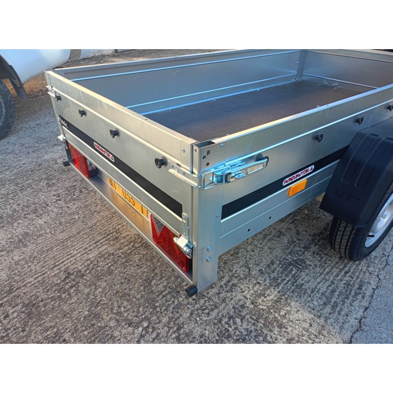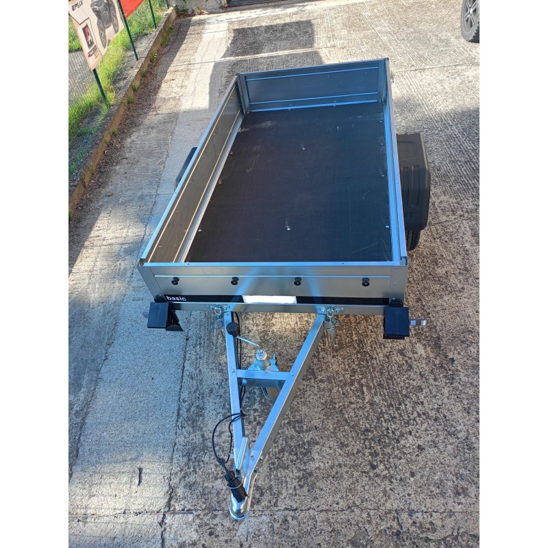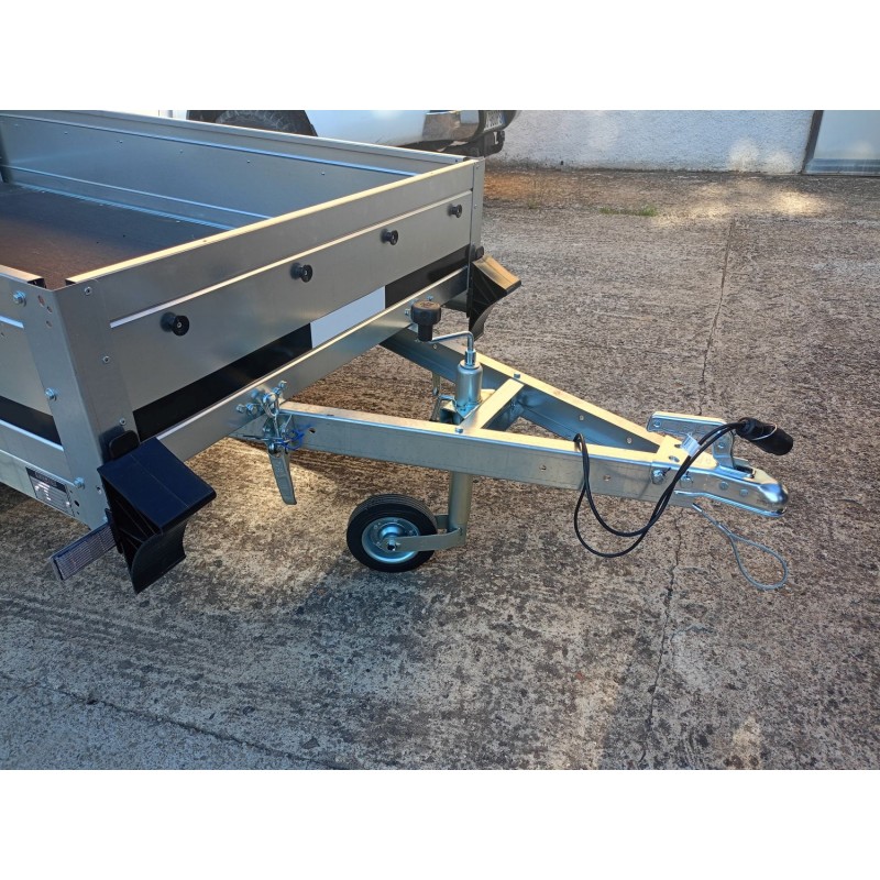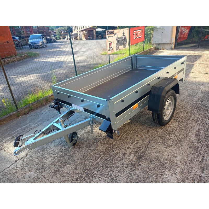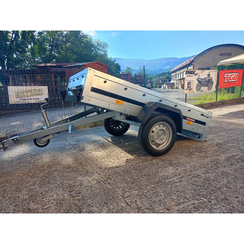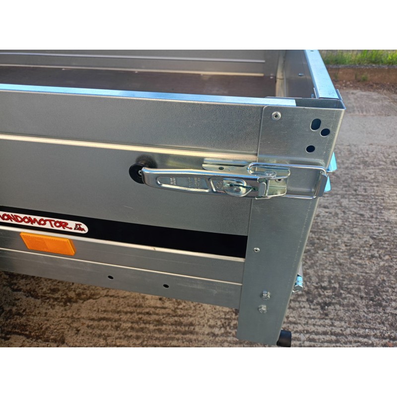 TIMONE A "V" , CASSONE RIBALTABILE , TELAIO ZINCATO , FONDO IL LEGNO MARINO FENOLICO ANTISCIVOLO , CUNEI FERMARUOTA , FANALE POSTERIORE CON LUCE RETROMRCIA INCORPORATA, RUOTINO DI SERIE
