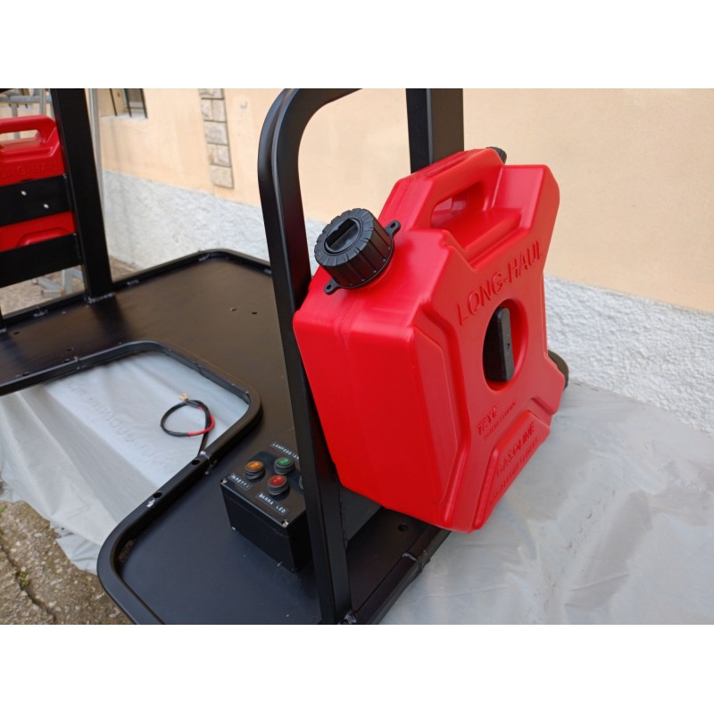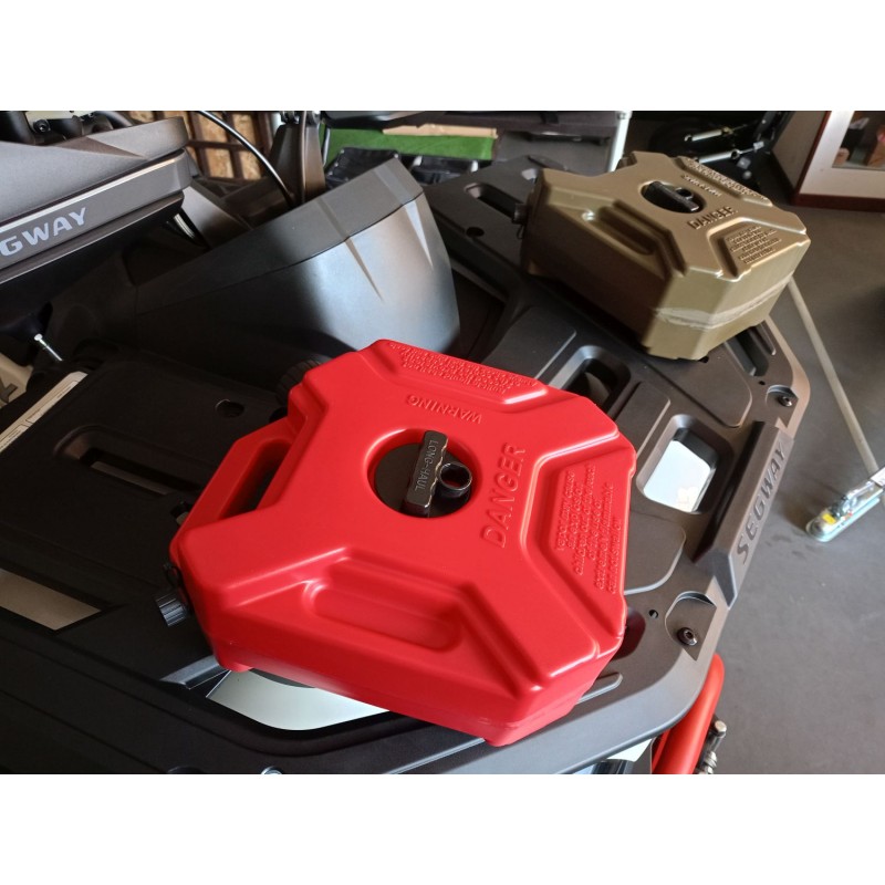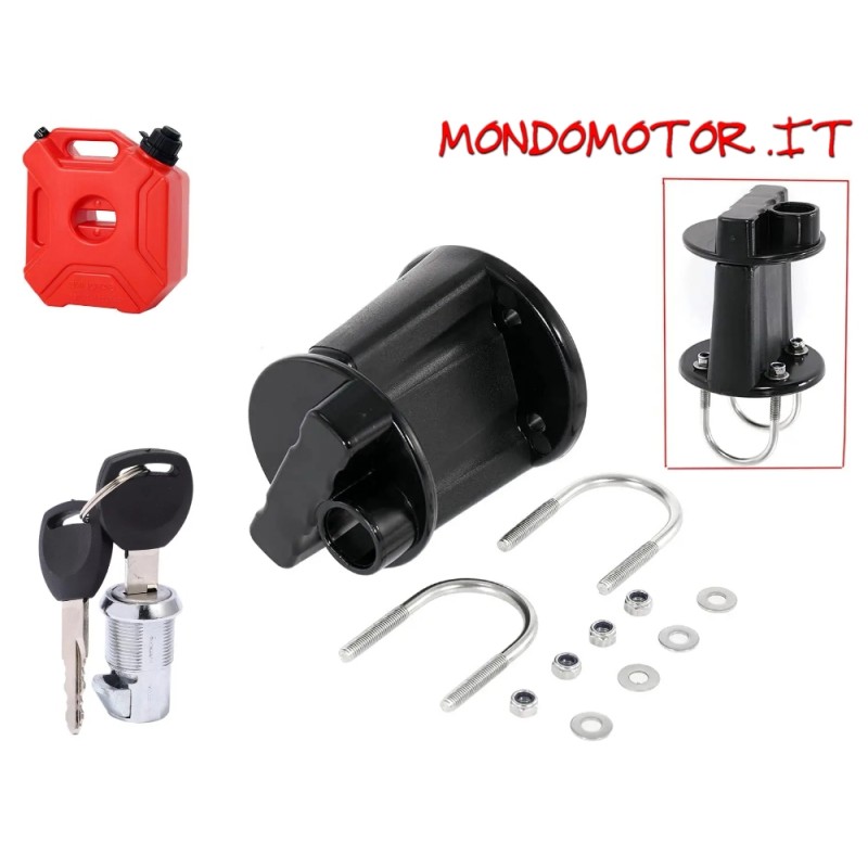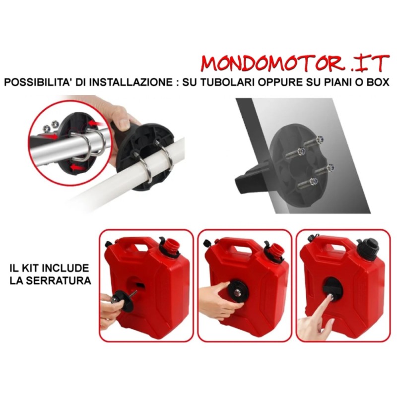 IL KIT INCLUDE : TANICA CON CAPACITA' 5 LITRI DI COLORE ROSSO, CON BOCCHETTONE INTERNO, ESTRAEBILE (CHE SI MONTA PER FACILITARE IL RIFORNIMENTO) E KIT DI FISSAGGIO CON SERRATURA